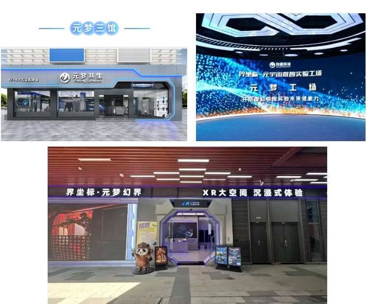 “元夢三館”體系自創(chuàng)立以來,承載著物通科技集團(tuán)在AI+XR融合服務(wù)中的空間策略與運營模型探索。三館分別承擔(dān)內(nèi)容驗證(元夢工場)、市場運營(元夢幻界)、政企復(fù)制(元夢共生) 功能,構(gòu)建起“內(nèi)容——用戶——應(yīng)用”的協(xié)同閉環(huán)結(jié)構(gòu)。
